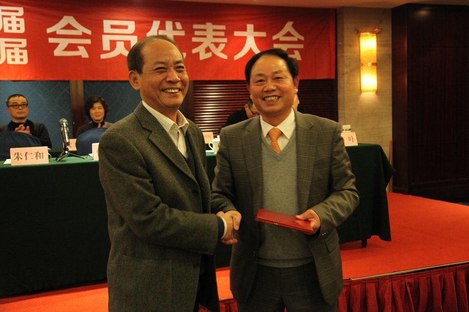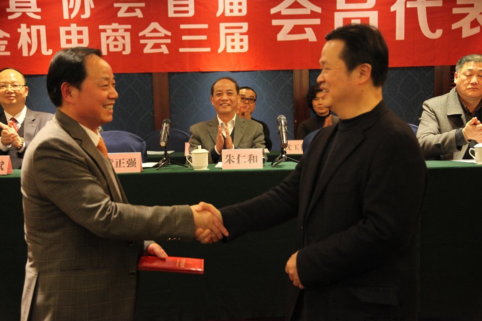 新任会长张月龙给中国五金交电化工商业协会理事长朱仁和颁发聘书