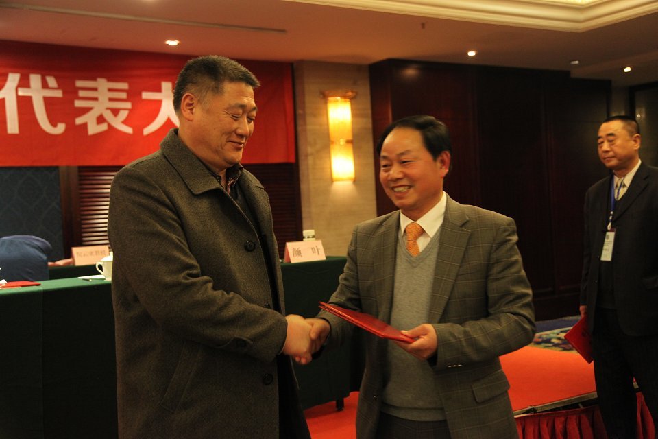 新任会长张月龙给国家工具五金质量监督检测站上海站站长徐东海颁发聘书