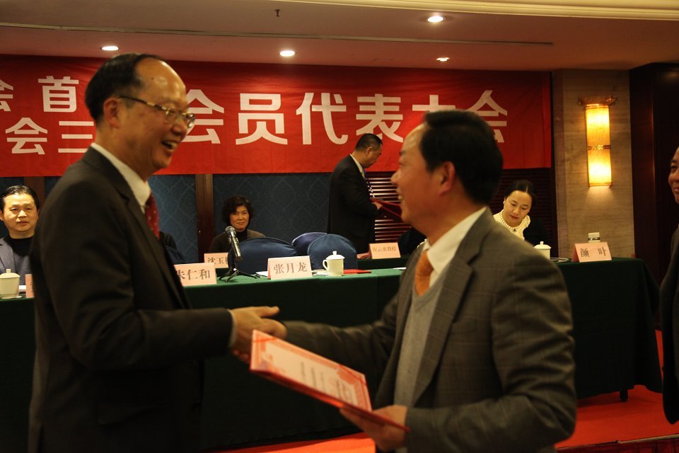 浙江省工商联党委副书记黄正强给新任会长张月龙颁发证书